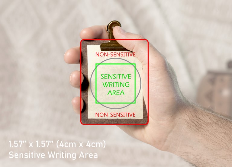 - The effect is inspired by the Center Tear Effect (see description here). Thanks to this trick, we limit the writing area to the appropriate place on the Pad. Only the central area of the Pad is sensitive (1.57” x 1.57” – see pictures). The writing detection is made thanks to the pencil pressure on that sensitive surface. All the other areas of the Psychic Center Pad are insensitive: no risk of double pressure caused by the hand or fingers on the edges. The technical limits of our Psychic Notepad 4.0 released in 2014 are now solved.
