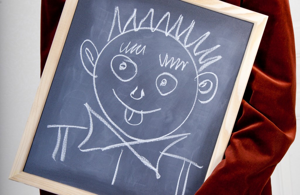 The Maxi Chalkboard looks exactly like an old school black slate (blackboard on one side, wood panel on the other). It is 16.5″ x 14″ x 0.8″ (42 cm x 36 cm x 2 cm) and it weighs a little over 2,2 pounds (about 1000 grams)!