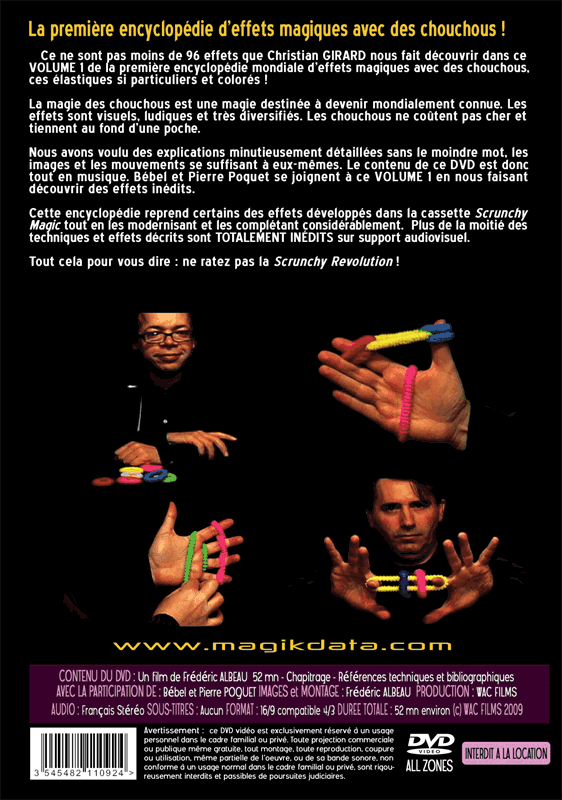 Nous avons voulu des explications minutieusement détaillées sans le moindre mot, les images et les mouvements se suffisant à eux-mêmes. Le contenu de ce DVD est donc tout en musique. Bébel et Pierre Poquet se joignent à ce VOLUME 1 en nous faisant découvrir des effets inédits. Cette encyclopédie reprend certains des effets développés dans la cassette "Scrunchy Magic" tout en les modernisant et les complétant considérablement.