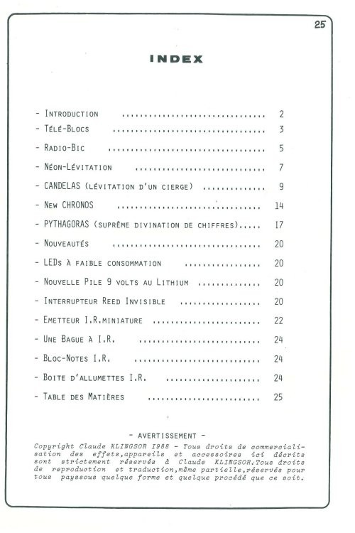 En 25 pages, klingsor décrit par le détail 13 illusions tout à fait remarquables, employant pour la plupart d'entre elles la technologie de la transmission infrarouge. Il va même jusqu'à concevoir une bague émettrice à infrarouge !